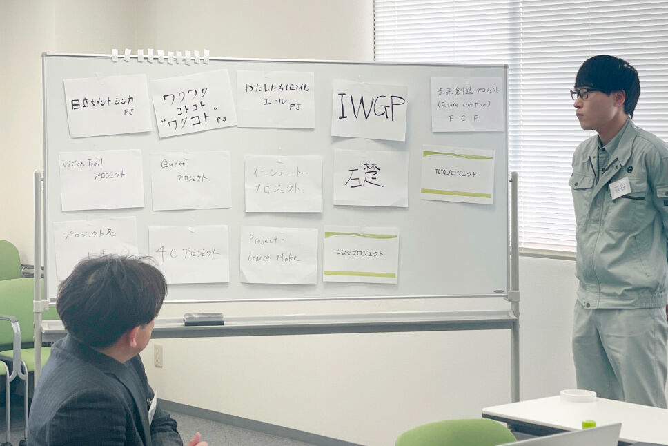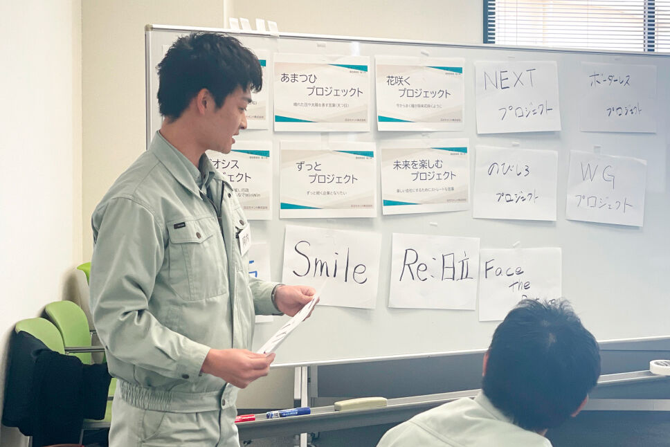 一人ひとりが事前に宿題として考えてきた「日立セメントのリブランディングプロジェクト名称」のアイデアをプレゼンテーションし、全員で投票。大多数の票が集まった「つなぐプロジェクト」に決定しました。