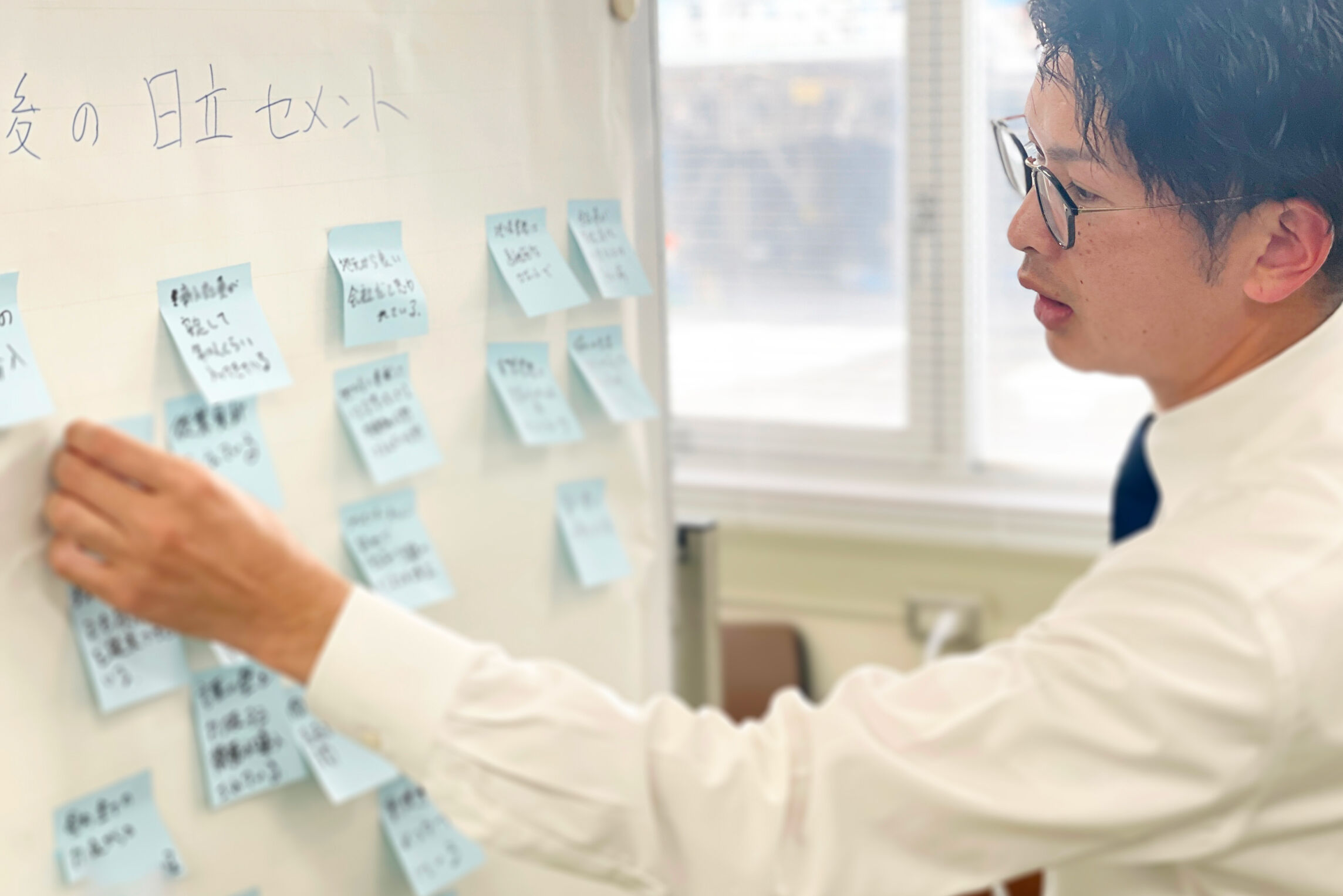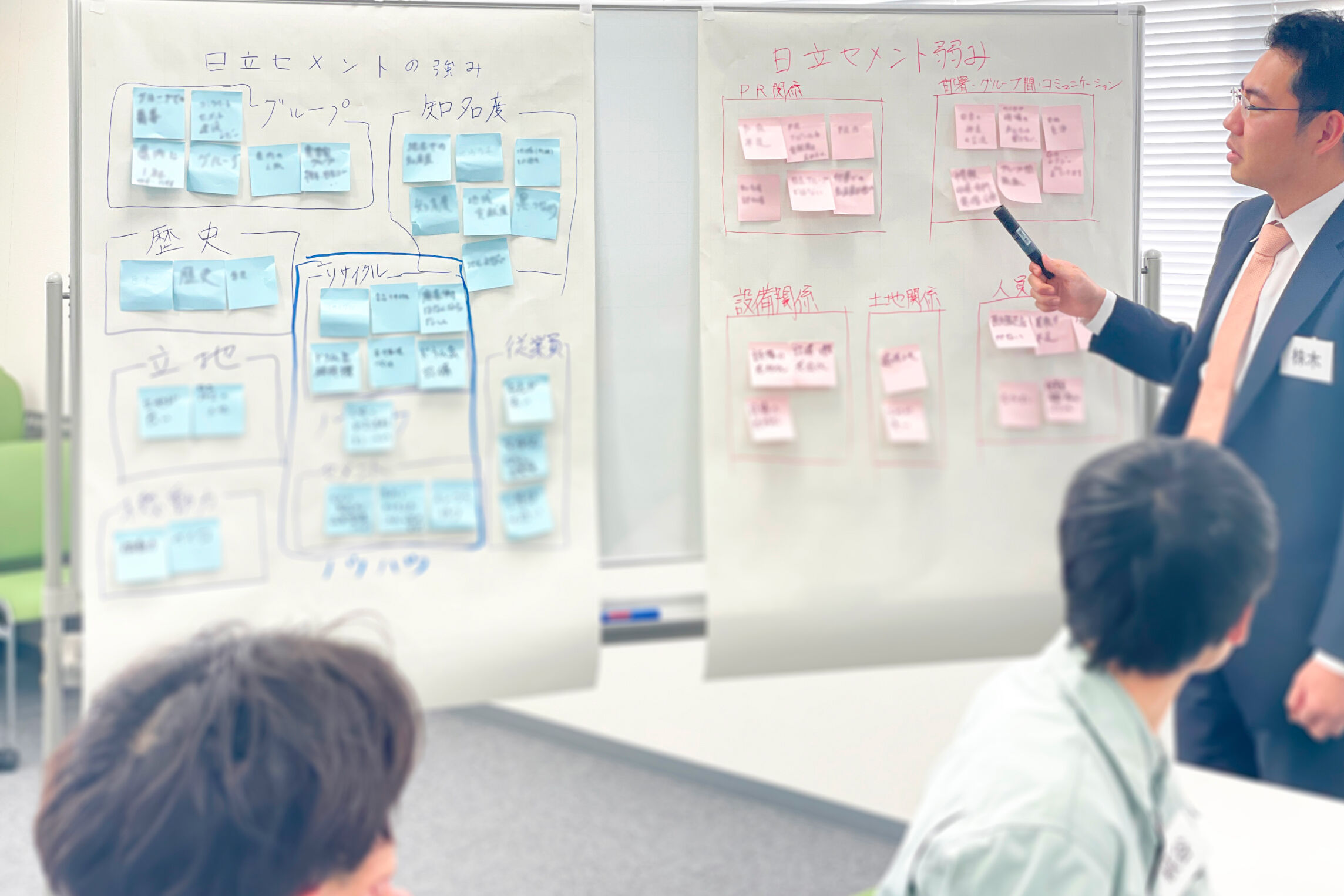 日立セメントの「強み」と「弱み」を、一人ひとりが思いつくままにポストイットに書き出し、全員で共有しました。普段当たり前に思っていたことでも、いざ言葉にして仲間と共有してみることで、さまざまな気づきが生まれます。