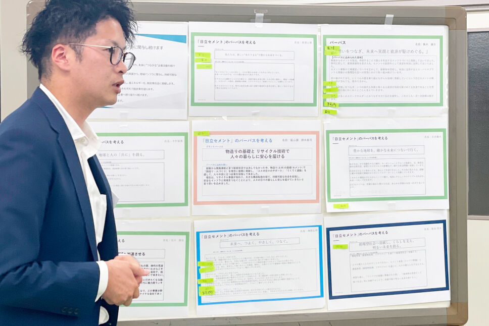 他社がどのようなパーパスを掲げて企業活動をしているか、好きなブランドを一つ調べてプレゼンテーション。印象的なパーパスや取り組みについて意見交換し、今後私たち日立セメントのパーパスを考えるにあたっては、どんなイメージが似合いそうかを議論しました。